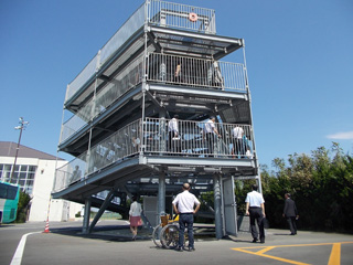 2013年に完成した津波非難タワー。このタワーは高さ8m、標高13mで、10mの浸水でも余裕ができるように設計されており、津波の威力を緩和するため、変則的な六角形の作りになっているのが特徴的です。
